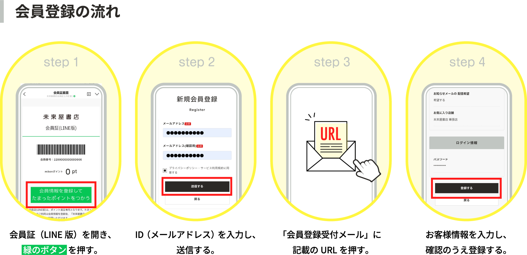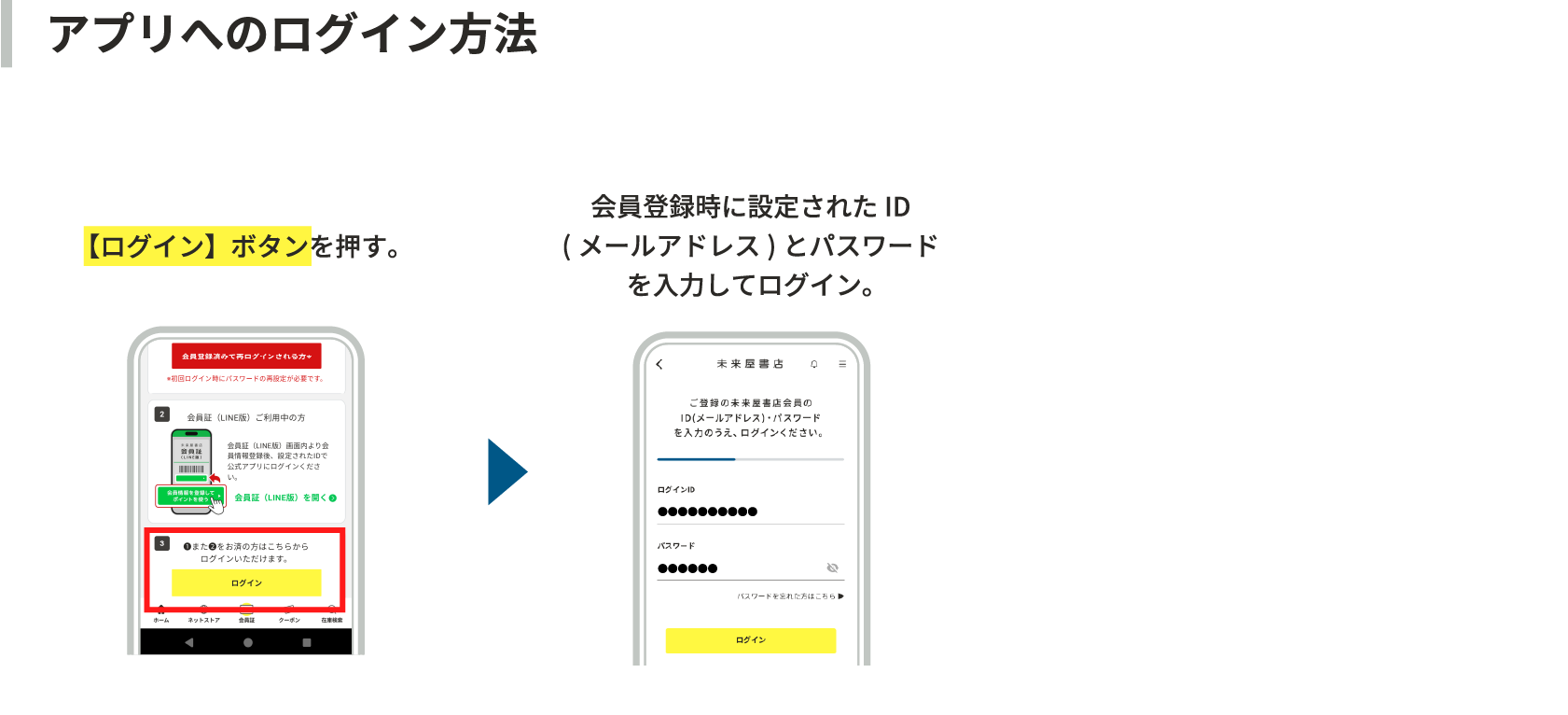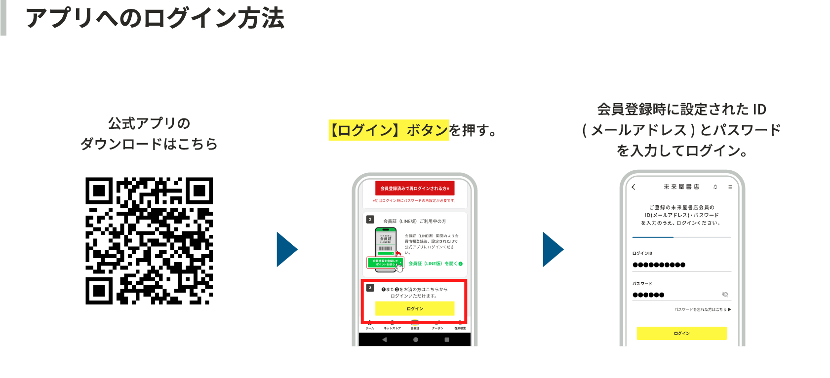 未来屋書店公式アプリと同じIDでログインいただくと、店舗で貯まったポイントとオンラインストアで貯まったポイントを一元管理でき、合算されたポイントをどちらのサービスでもお支払にご利用いただけます。